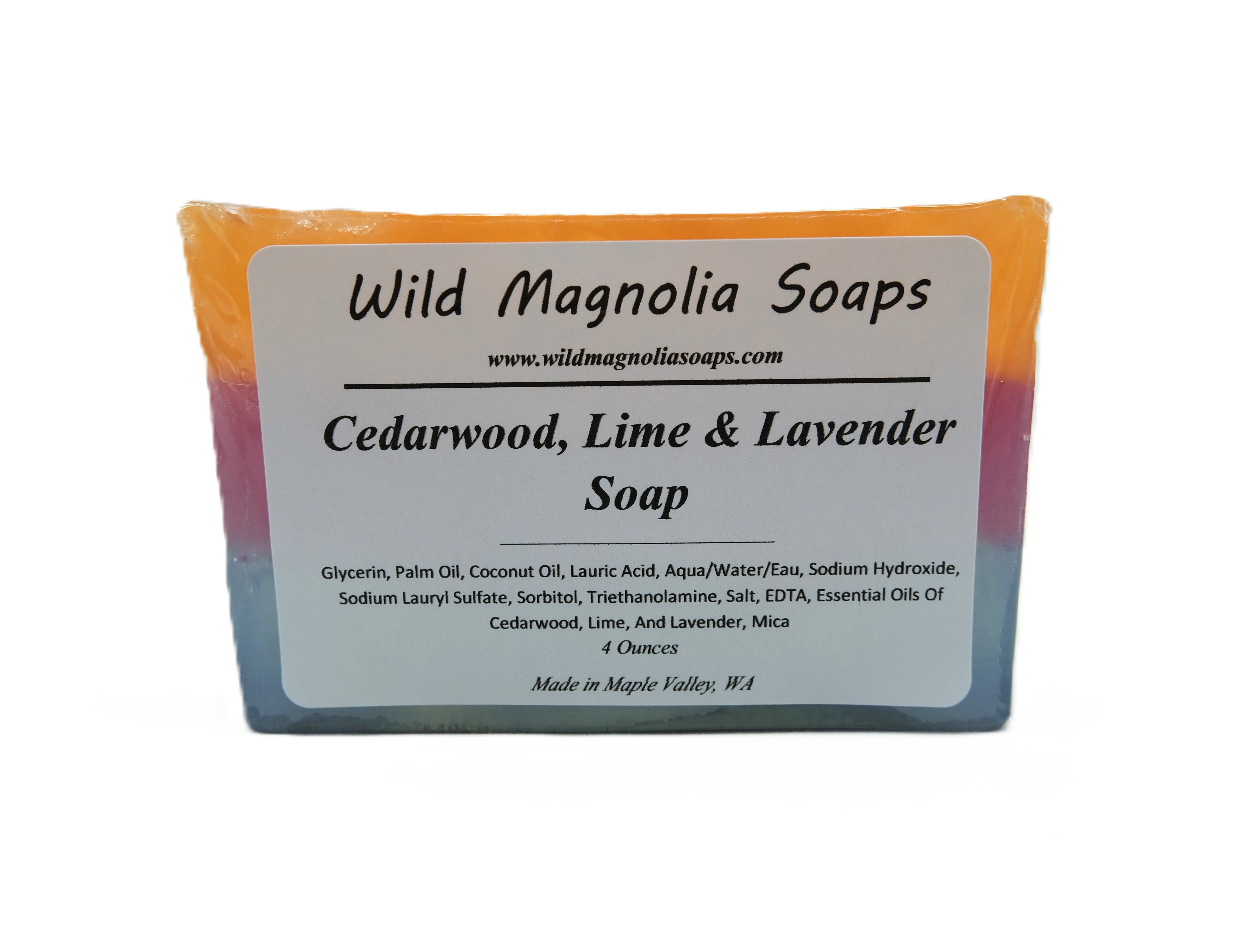 Ingredients: Glycerin, Palm Oil, Coconut Oil, Lauric Acid, Water, Sodium Hydroxide, Sodium Lauryl Sulfate, Sorbitol, Triethanolamine, Salt, EDTA, Essential Oils Of Cedarwood, Lime, And Lavender, Mica